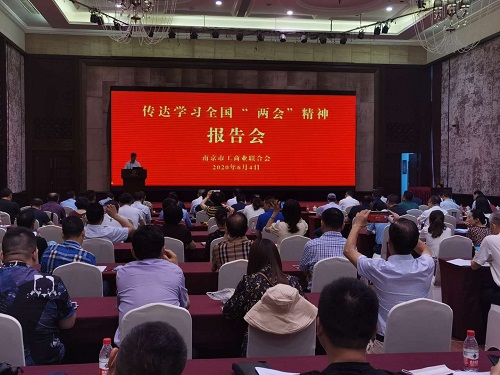 2020年6月4日下午,南京市工商联在江苏饭店举办,传达学习全国“两会”精神报告会,特邀请全国人大代表邢青松和全国政协委员杨德才,传达习近平总书记重要讲话精神和全国“两会”精神。市工商联党组织书记丁铭主持并讲话,市工商联全体驻会领导、部分企业家主席(会长)、区工商联领导班子成员、部分商会领导班子成员以及市工商联全体机关干部共150余人参加报告会,石材商会范中阳常务副会长,孟桂根执行秘书长参加会议.